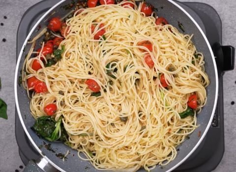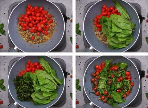 - Add the halved cherry tomatoes, packed baby spinach, and chopped basil leaves to the skillet. Cook for about 1 minute, stirring gently. The spinach will start to wilt down and the tomatoes will get slightly soft. Don't cook too long or the vegetables will get mushy. You want them to keep some texture and bright color.