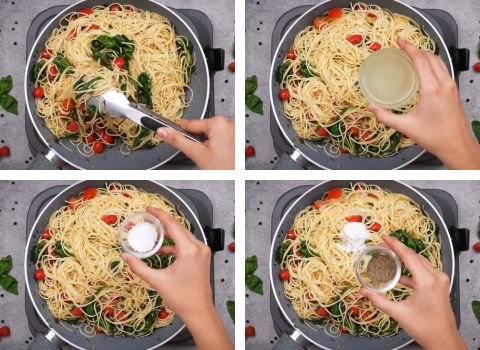 - Add the drained pasta to the skillet with the sauce and vegetables. Use tongs or a large spoon to toss everything together well. Pour in the fresh lemon juice and sprinkle the salt and black pepper over everything. Toss again to make sure every piece of pasta gets coated with the lemon mixture. The pasta should look shiny and smell bright and fresh.