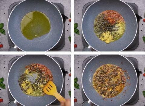- While your pasta cooks, heat the olive oil in a large skillet over medium heat. Add the baby capers, red pepper flakes, minced garlic, and lemon zest. Saute quickly for about 8-10 seconds to release the flavors – don’t overcook, or the garlic will burn.