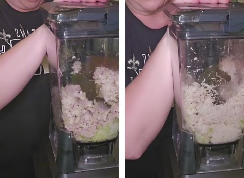 - Place the cooked chicken into the processor with the onion and celery paste. Blend until the chicken becomes smooth but still has slight texture. It should hold its shape and not be watery.