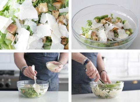 - Place the dry romaine in a large bowl. Add a handful of croutons and cheese shavings. Sprinkle sea salt and cracked pepper. Pour a ring of dressing along the inside edge of the bowl rather than pouring in the middle. This helps coat the greens evenly. Use tongs to move the lettuce around the bowl in wide scoops. Keep mixing until the leaves look evenly coated. Taste one piece to see if you need more cheese, croutons, or pepper. Adjust as needed.
