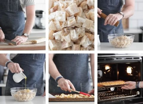 - Start with a loaf of bread such as a baguette or any firm bread you have on hand. Cut it lengthwise, then cut it into smaller pieces until you have small, bite-size cubes. These pieces should be easy to chew and easy to grab with the greens. Place the pieces in a bowl. Add a sprinkle of sea salt and cracked pepper. Drizzle a little olive oil over the bowl. Mix with your hands or a spoon until each piece feels lightly coated. Spread them on a sheet pan lined with parchment. Spread them out so they toast evenly and get crisp instead of soft. Place the pan in a 375°F oven. Toast for 15 to 20 minutes. Check them at the end and pull them out when they are golden and crunchy.
