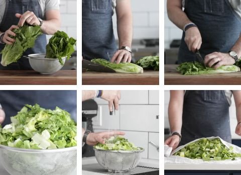 - Remove any wilted outer leaves from the romaine heads. Cut each head in half lengthwise. Make two more slices to divide each half into three long sections. Chop these into 1- to 1½-inch pieces. Place the pieces in a colander. Rinse under cold water to remove dirt or grit. Shake well to release water. Spread the pieces on a clean towel. Wrap them gently and pat dry. Dry greens hold dressing much better.
