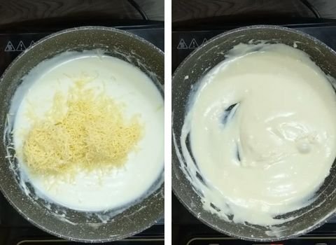 - Turn the heat to low. Add the shredded cheese and stir constantly until fully melted and smooth.