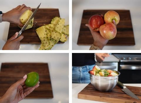 1. Prep Fruit – Peel and chop pineapple into chunks. Wash, core, and chop apples. Peel lime. Separate mint leaves.
