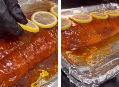 Top each salmon fillet with fresh lemon slices and a sprinkle of fresh parsley. These additions add flavor and keep the salmon moist during baking.