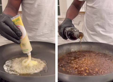 - While the salmon bakes, prepare your glaze. In a small saucepan over medium heat, combine butter, oil, garlic paste, soy sauce, honey, brown sugar, pineapple juice, sriracha, and bourbon. Stir constantly as the ingredients combine and warm through.