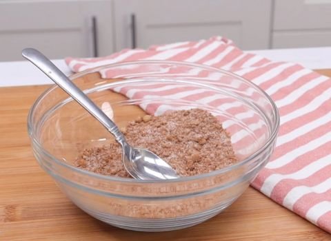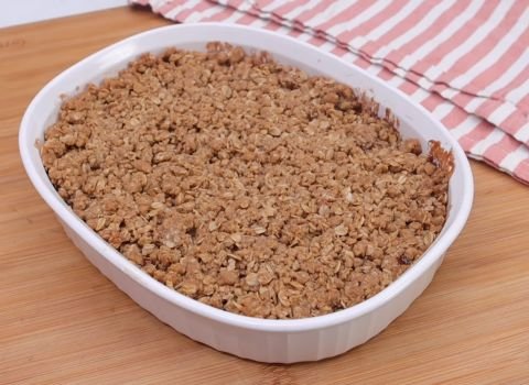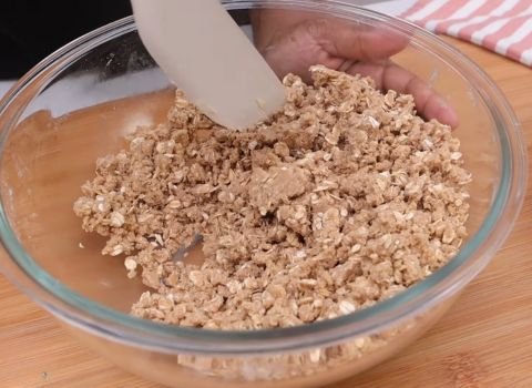 - In a separate bowl, mix oats, flour, brown sugar, and cinnamon. Add cold butter pieces. Use clean hands or a pastry cutter to rub the butter in until the mix looks crumbly.