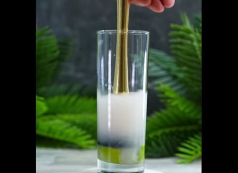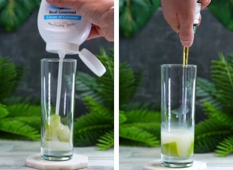 - Pour the 1 ounce of cream of coconut over the lime in the glass. Then, add the 2 ounces of white rum.