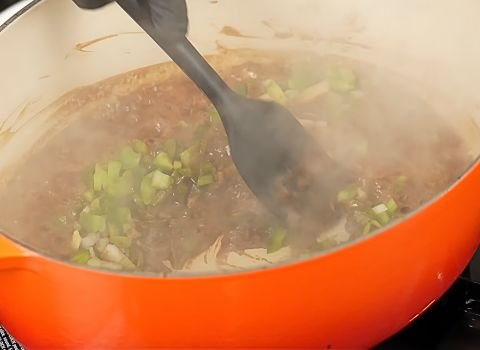 - Turn off the heat. Carefully add onions, celery, and bell peppers. Stir well as the mixture bubbles. The vegetables cool the roux and stop further darkening.