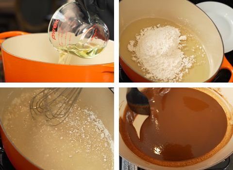 - Place the Dutch oven on medium heat. Pour in the oil, then add the flour. Whisk right away until smooth. Keep stirring without stopping. The color slowly shifts from pale to golden, then deeper brown. This step takes patience. The goal stays a deep chocolate shade without burning.