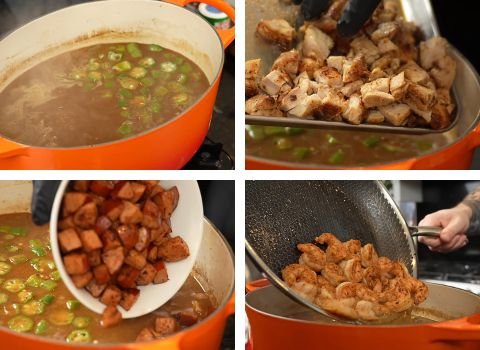 - Add the cooked chicken, sausage, and okra to the gumbo pot. Stir gently. Let it simmer so the flavors blend well. Add the shrimp during the last 8–10 minutes. Stir in gumbo file near the end and mix well. The gumbo thickens as it simmers.