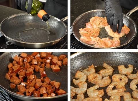 Heat a skillet with a small amount of oil over medium heat. Cook the chicken thighs until fully cooked, about 6–8 minutes per side. Remove and chop into bite-size pieces. Brown the sausage for about 5 minutes. Lightly cook the shrimp for 2–3 minutes until just pink. Set all proteins aside.
