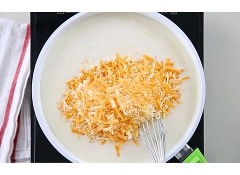 - Whisk in the dry mustard, salt, and white pepper. Add the shredded cheddar cheese. Whisk until the cheese fully melts and the sauce is smooth.