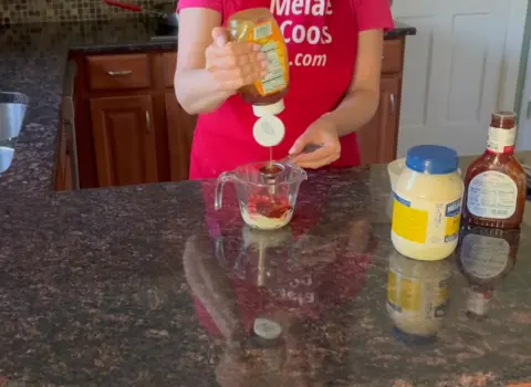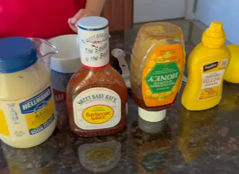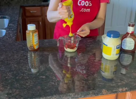 Grab 1/4 cup of mayonnaise, 2 tablespoons of barbecue sauce, 2 tablespoons of honey, 1 tablespoon of yellow mustard, and 1 teaspoon of lemon juice. I like to measure everything out first so it’s easy to mix.