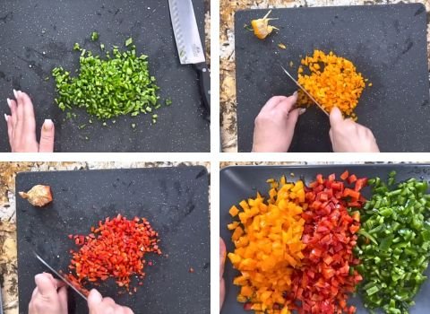 1. Wash all vegetables under cold water and pat them dry. Slice the jalapeños in half, remove the seeds and white veins, then dice them finely. Cut the bell peppers, remove the cores and seeds, and dice them into small, even pieces. Mince the garlic cloves very finely.