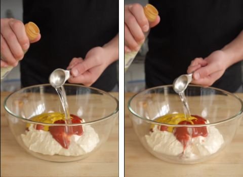 • Vinegar (2 tablespoons): White vinegar gives the sauce its tang. It keeps the sauce from feeling too heavy. Apple cider vinegar works, too—it just makes the taste a little fruitier.