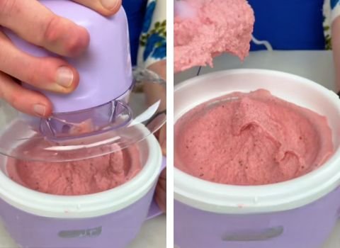 After 20 minutes, check if the ice cream is soft-serve consistency. If it’s not thick enough, churn for 5 more minutes. When it’s ready, turn off the machine and unlock the lid.