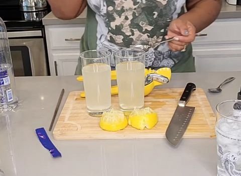 - While the tea cools, juice your lemons. You will need about half a cup of fresh lemon juice. This is usually 2-3 large lemons. In your pitcher, combine the lemon juice with one cup of cold water. Add your sweetener. Start with three tablespoons and stir very well. Taste the lemonade. If you want it sweeter, add one more tablespoon of sweetener.