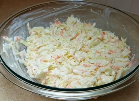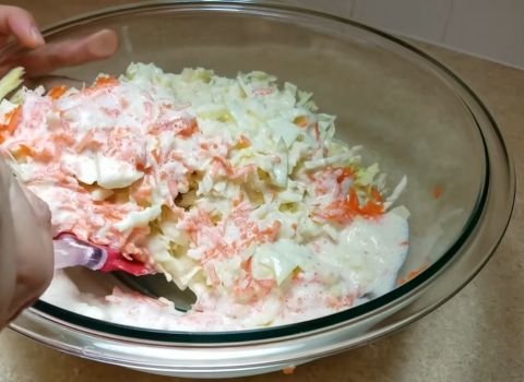 - Pour the dressing over the cabbage and carrot. Mix well for 2–3 minutes until everything is evenly coated.