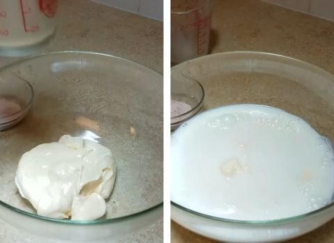 In a medium bowl, pour ¾ cup mayonnaise. Add ½ cup milk and ½ cup buttermilk. Mix them together first in a measuring cup, then whisk all three ingredients until smooth and creamy.