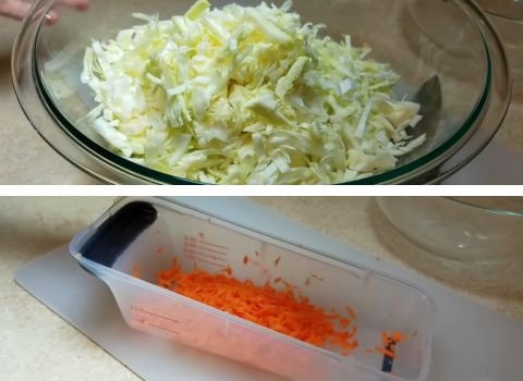 - Take 1 to 1½ pounds of green cabbage. Remove any damaged outer leaves. Cut into quarters, then slice into thin strips (about 1/8 inch). Cut longer strips into 2–3 inch pieces. You should have about 6–8 cups. Now wash 1 carrot, peel if you like, then shred it using a grater or food processor. Add to the cabbage and toss to combine.