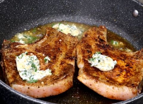 Once pork chops are seared, spoon garlic butter over the top of each chop. Tilt the pan slightly to let butter melt over the sides for extra flavor.