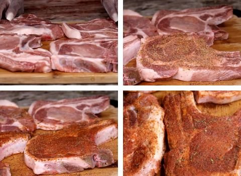 You rub this mix all over the meat, including the edges. Let the chops sit for about five minutes after seasoning. This lets the spices stick to the meat better.