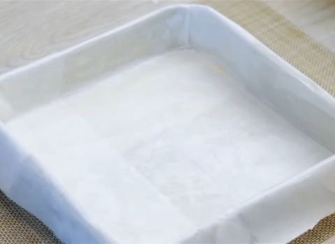 Turn on your oven to 350 degrees Fahrenheit. Take a 9-inch cake pan and line the bottom with parchment paper.