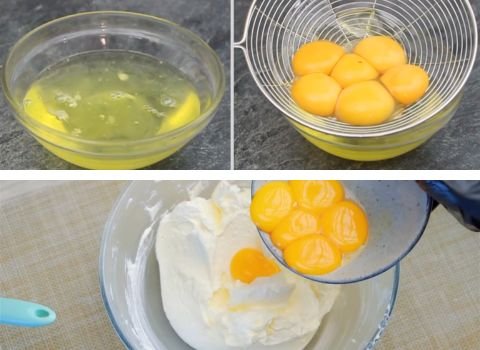 - Take the 6 eggs and separate the whites from the yolks. Put the egg whites in one clean bowl and the yolks in another bowl. Add the yolks to the butter mixture. Make sure no yolk gets into the whites or they will not whip well.