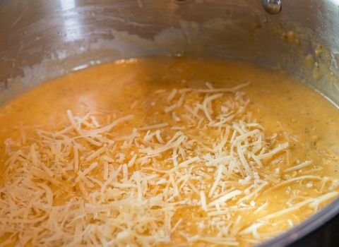 - Remove from heat and stir in the Parmesan cheese. Mix until fully melted and the sauce is smooth and rich.
