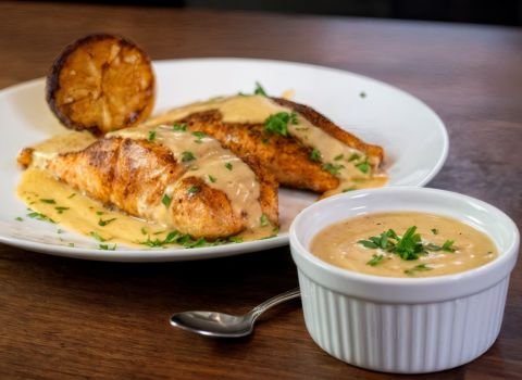 When cooking salmon, you’re already working with a fish that has a rich, naturally fatty texture. The Alexander sauce brings the same creamy, buttery feel, so they blend together very well.