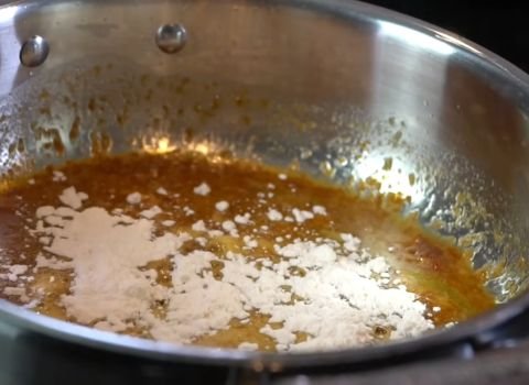 - Sprinkle in the flour and whisk continuously to form a smooth paste. Cook for 1–2 minutes to remove the raw flour taste.