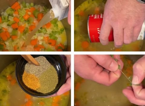 - Pour the entire gallon of chicken broth into the pot. Add the can of cream of chicken soup. Stir very well until the soup is fully mixed into the broth. Now, add the black pepper, poultry seasoning, and seasoned salt. Let the pot heat up until it starts to simmer lightly. Add the fresh thyme.