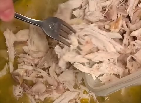 While the dumplings cook, pull the meat from the rotisserie chicken. Shred the chicken into small pieces using your hands or two forks.