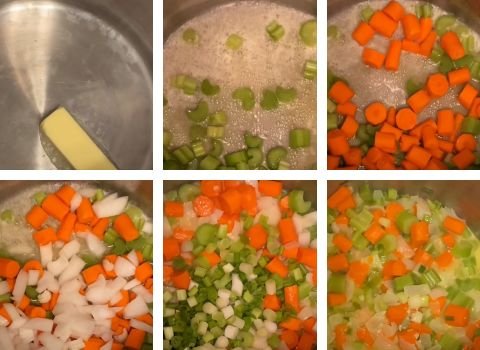- Put your large pot on the stove over medium heat. Add the butter and let it melt. Put in the chopped celery, carrots, onion, garlic, and green onion. Stir everything together. Let the vegetables cook for about twenty minutes, until they become soft.