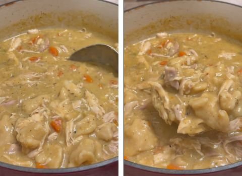 Once the dumplings are done, add the shredded chicken to the pot. Stir slowly to mix it in. Turn off the heat.