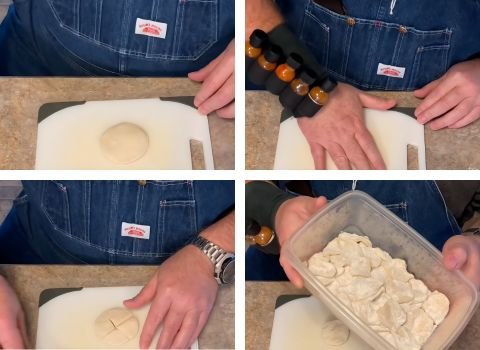 - Open the cans of biscuits. Place each biscuit on a flat surface. Press down on each one with your hand to flatten it. Then, cut each flattened biscuit into four small strips. Put your flour in a small bowl. Coat each dough strip in the flour.