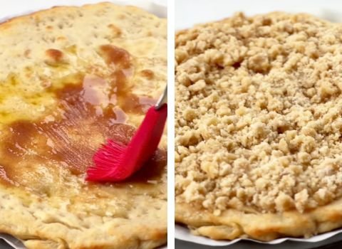 Prepare the cinnamon butter and crumble. Spread the butter over the partially baked crust, then sprinkle the crumble evenly on top.