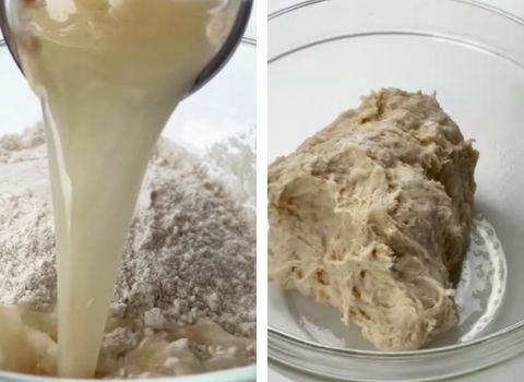 Now add the flour and the remaining salt into the yeast mixture. Use a spoon or your hands to mix it together slowly. Keep mixing until a soft dough forms. It may look a little rough, and that is okay. Do not overmix, just combine until no dry flour is left.