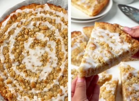 This treat has a warm, fresh-baked appeal that makes it special. The soft crust combined with the crunchy crumble and sweet glaze creates a perfect balance.