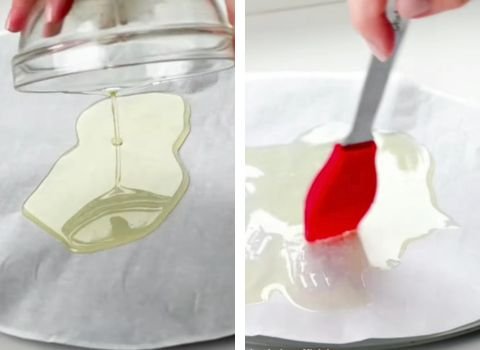 Take a 12-inch pizza pan and line it with parchment paper. Pour the remaining oil mixture onto the paper and spread it across the whole surface. This helps stop sticking and gives the bottom of the bread great flavor.