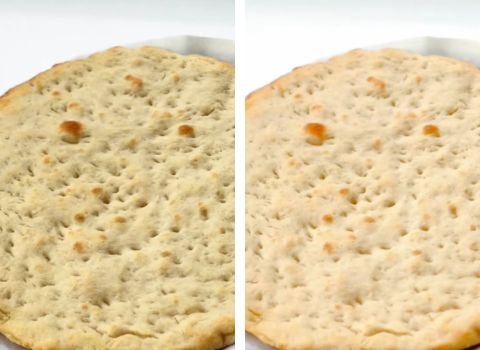 Spread the dough evenly on the pan without pressing too hard. Light dimples help it bake evenly. Bake just until lightly golden during the first bake. Overbaking can dry the crust and reduce softness.
