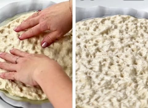 Move the risen dough onto the prepared pan. Gently stretch it out using your hands to fill the pan from edge to edge.
