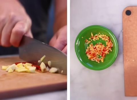 Peel and finely chop 3–4 garlic cloves and a thumb-sized piece of ginger. Add half a chopped chili for mild heat. Mix these together in a small bowl and set aside.