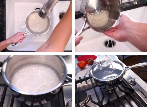 Start with 1 cup of white rice. Wash it a few times to remove excess starch. Use 1.75 cups of water and bring it to a boil.