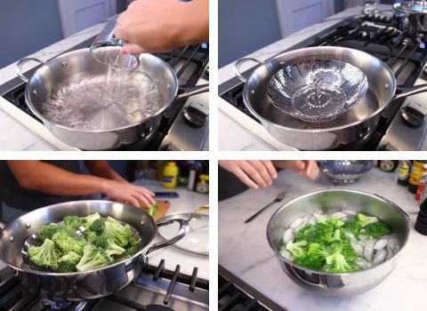 4. Fill a pot with 1 inch of water and bring to boil. Place broccoli in steamer basket and cover. Steam for 3 minutes until bright green and crisp. Transfer immediately to ice bath to stop cooking.