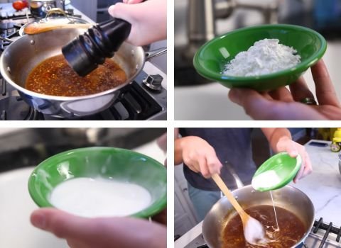 • 2–3 tablespoons cornstarch: Mixed with water, cornstarch thickens the sauce to coating consistency. Arrowroot powder or potato starch work equally well. Tapioca starch creates a glossier finish.