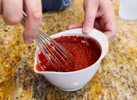 - Use your whisk or fork to mix the tomato paste and water together. Keep mixing until it is completely smooth and there are no lumps of paste left.