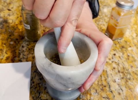 - Place dried basil, dried oregano, and celery seed into your mortar. Use your pestle to grind them into a fine mix. Move the pestle in soft circles until the herbs break down.